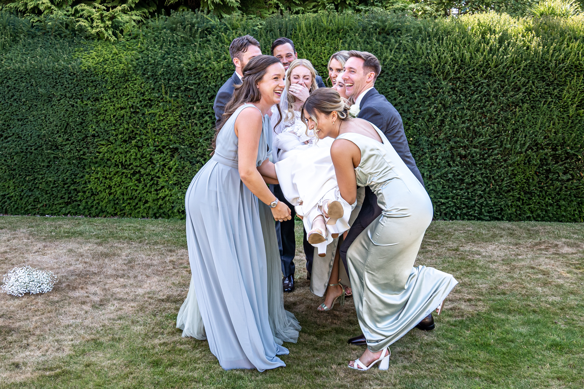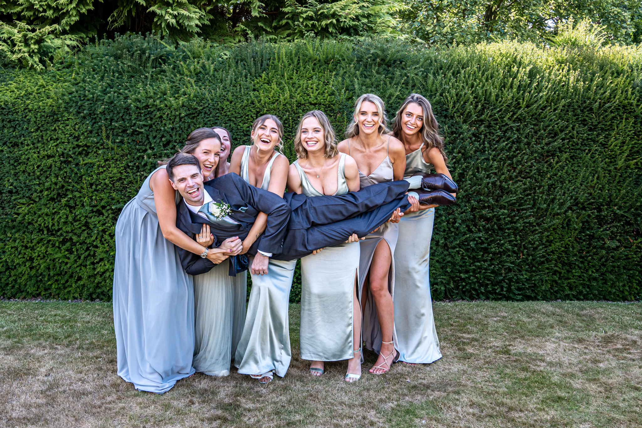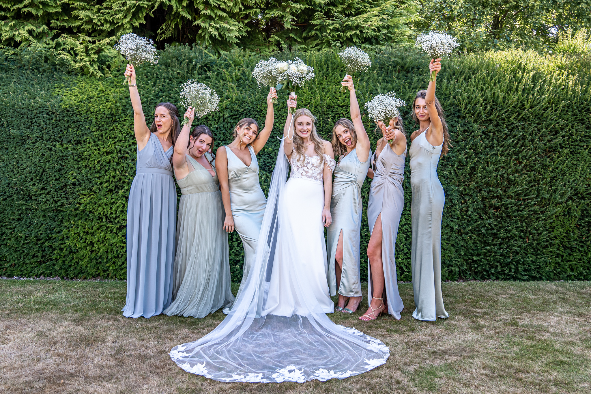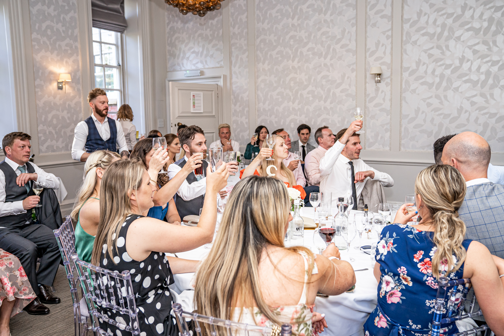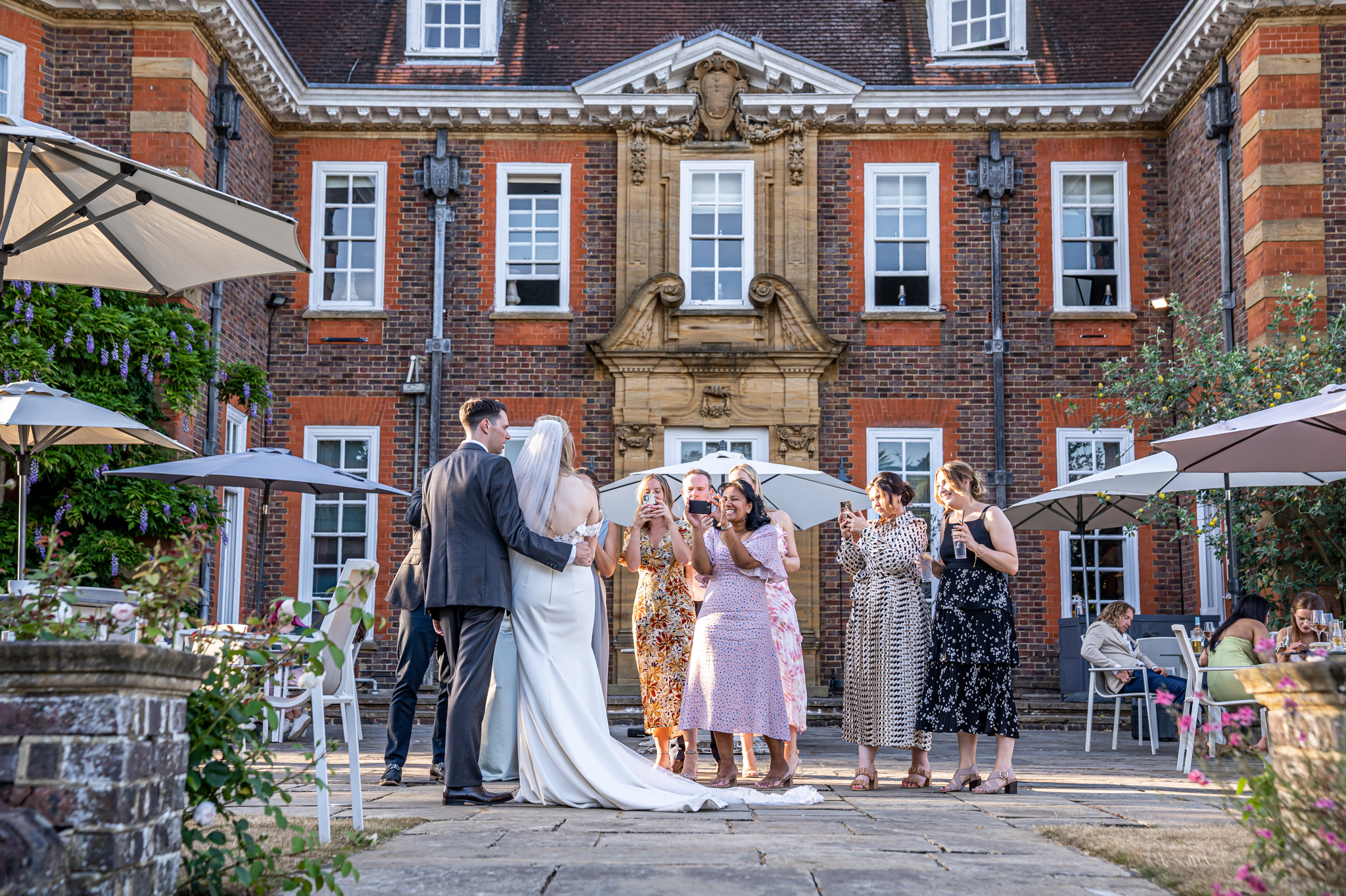 After I photographed the confetti shots and some cute pooch shots of the newlyweds with their pups, we then all headed back to Barnett Hill Hotel for Steph and James’s wedding reception. The couple had their champagne reception outside in the summer sunshine, I then photographed the group shots by the koi carp pond.