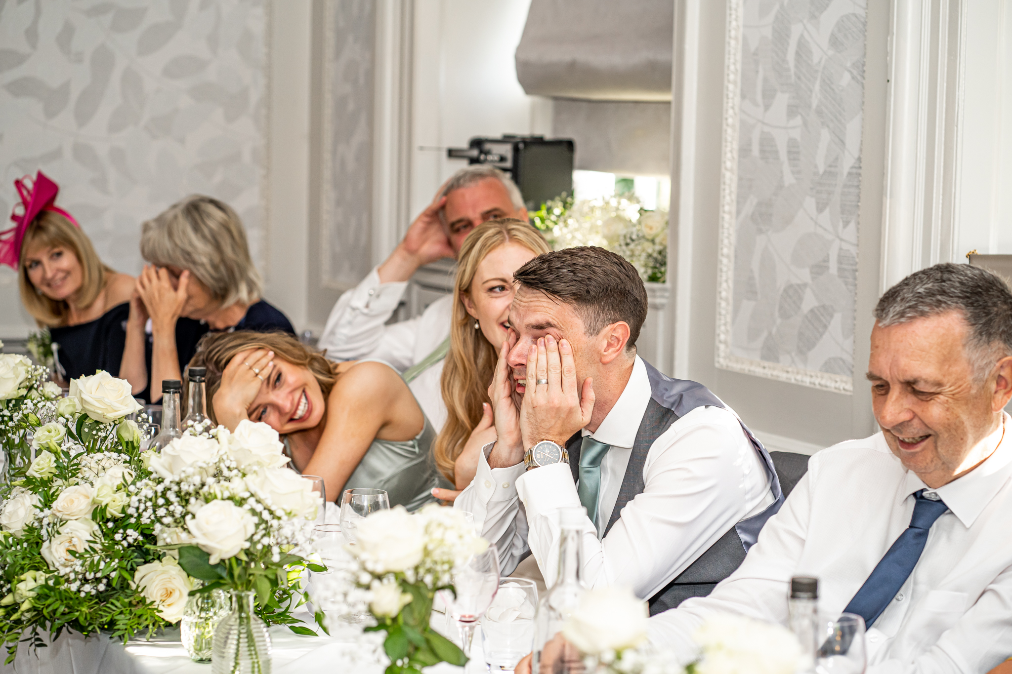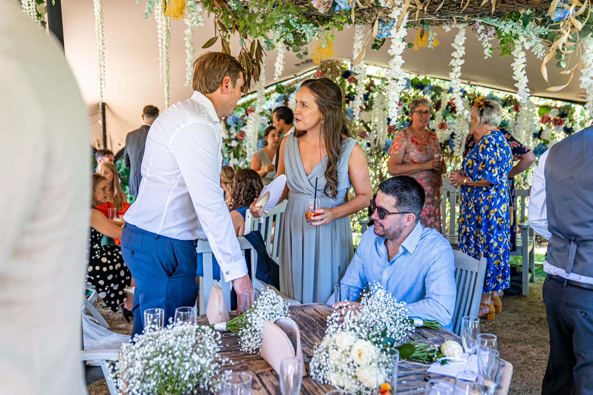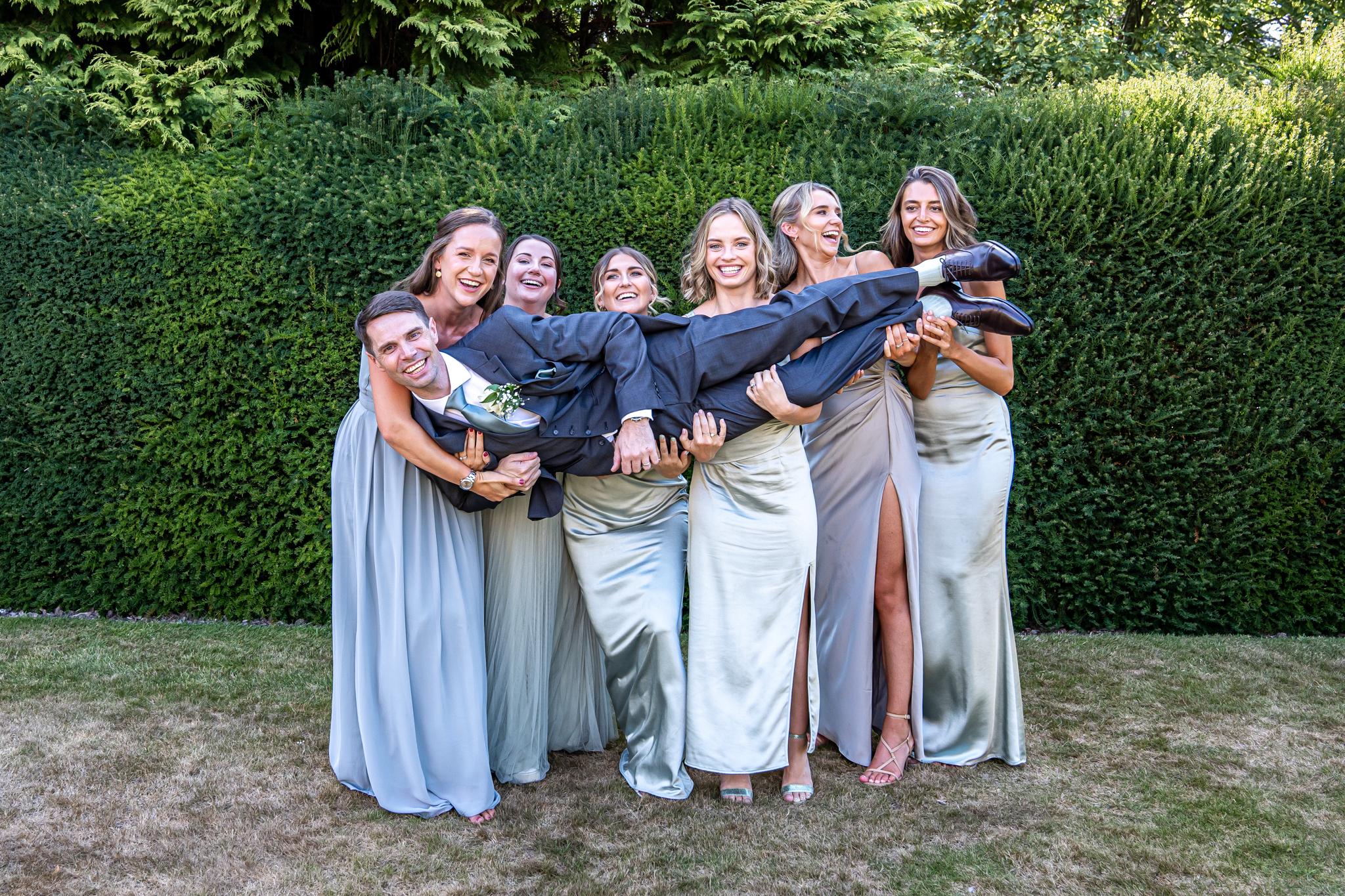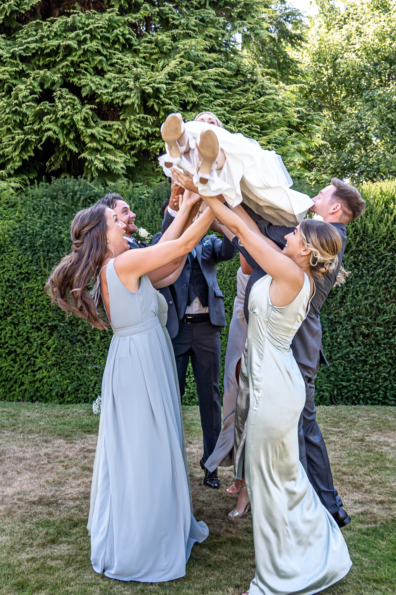 After I photographed the confetti shots and some cute pooch shots of the newlyweds with their pups, we then all headed back to Barnett Hill Hotel for Steph and James’s wedding reception. The couple had their champagne reception outside in the summer sunshine, I then photographed the group shots by the koi carp pond.