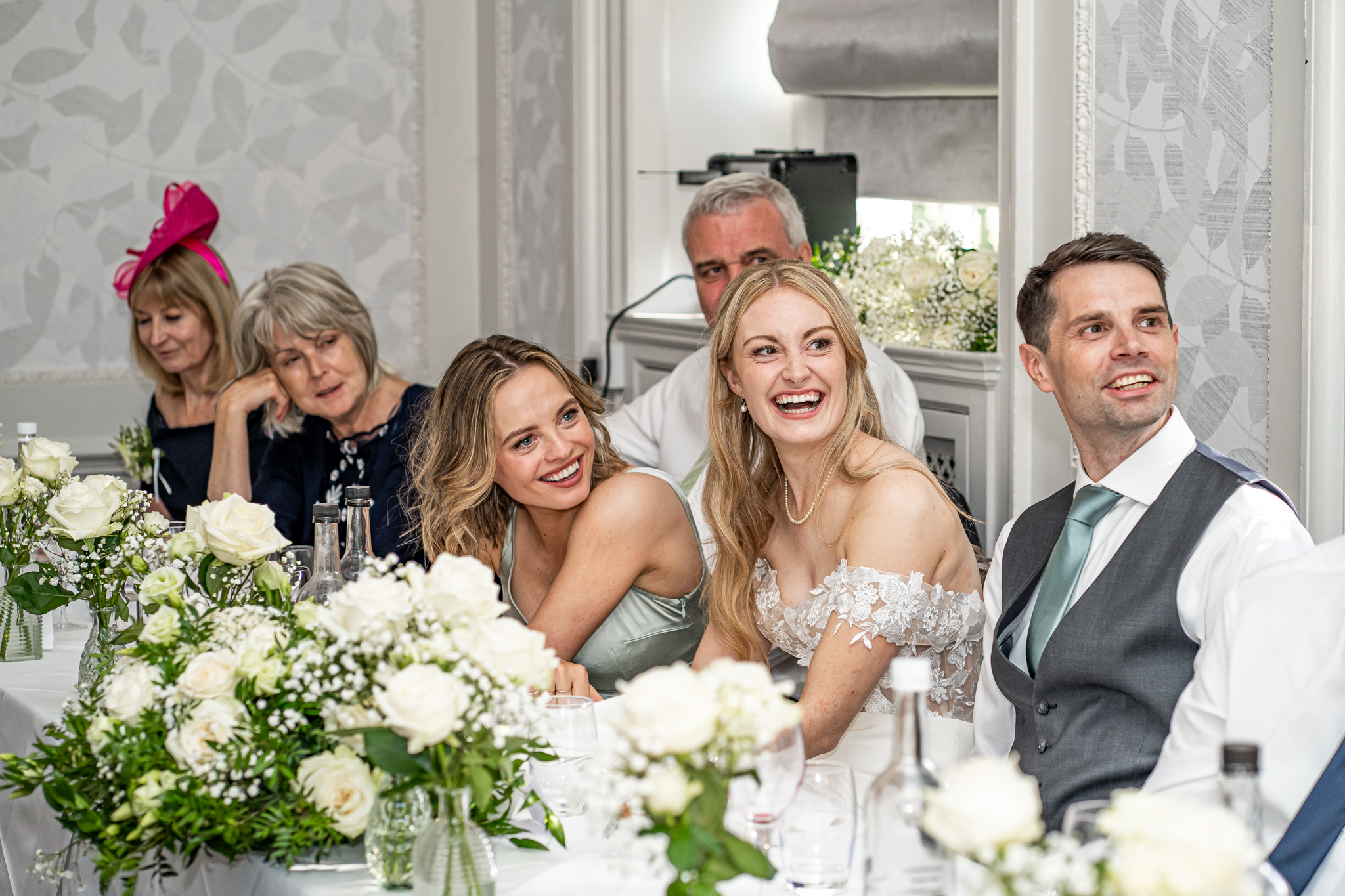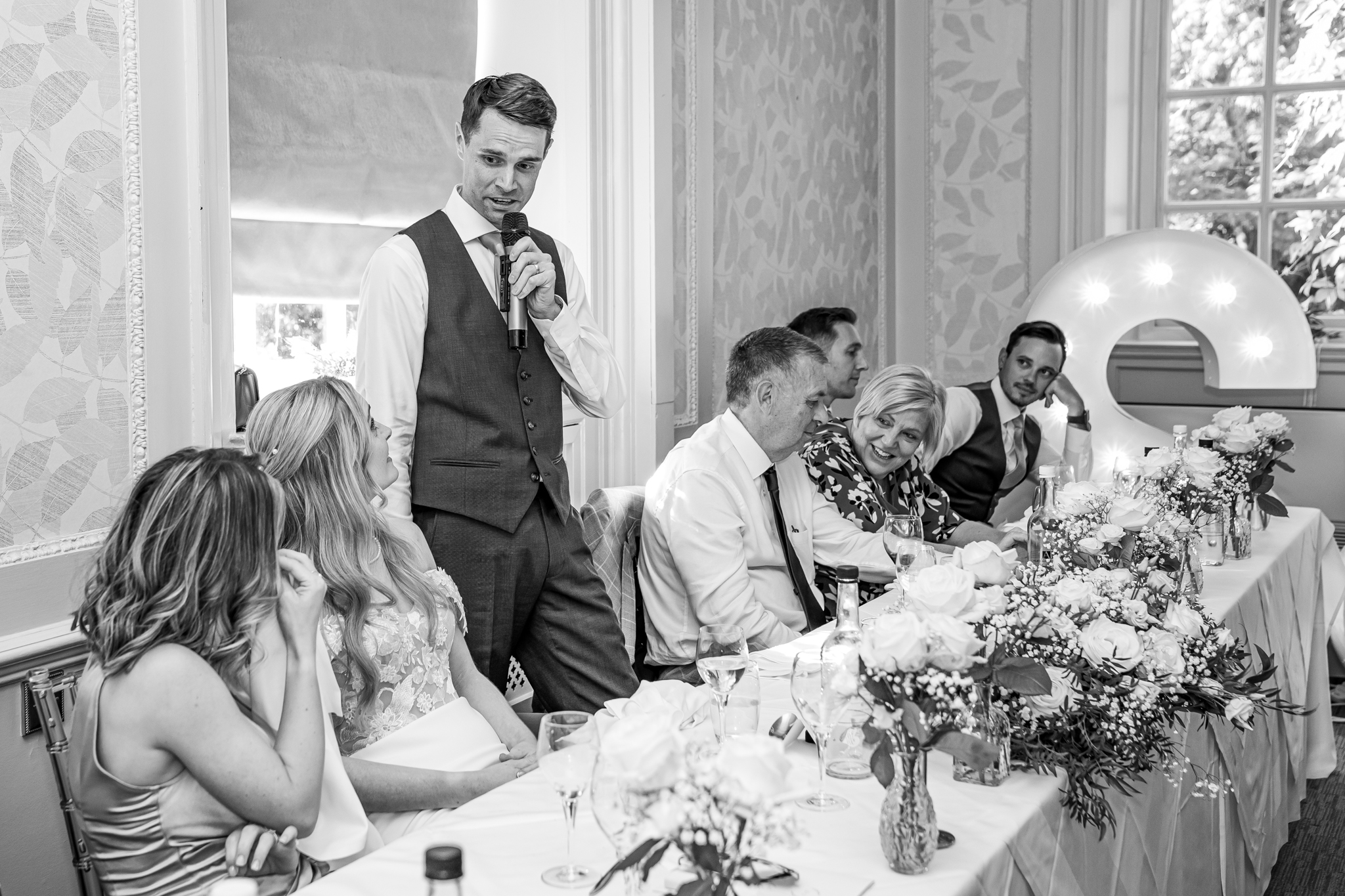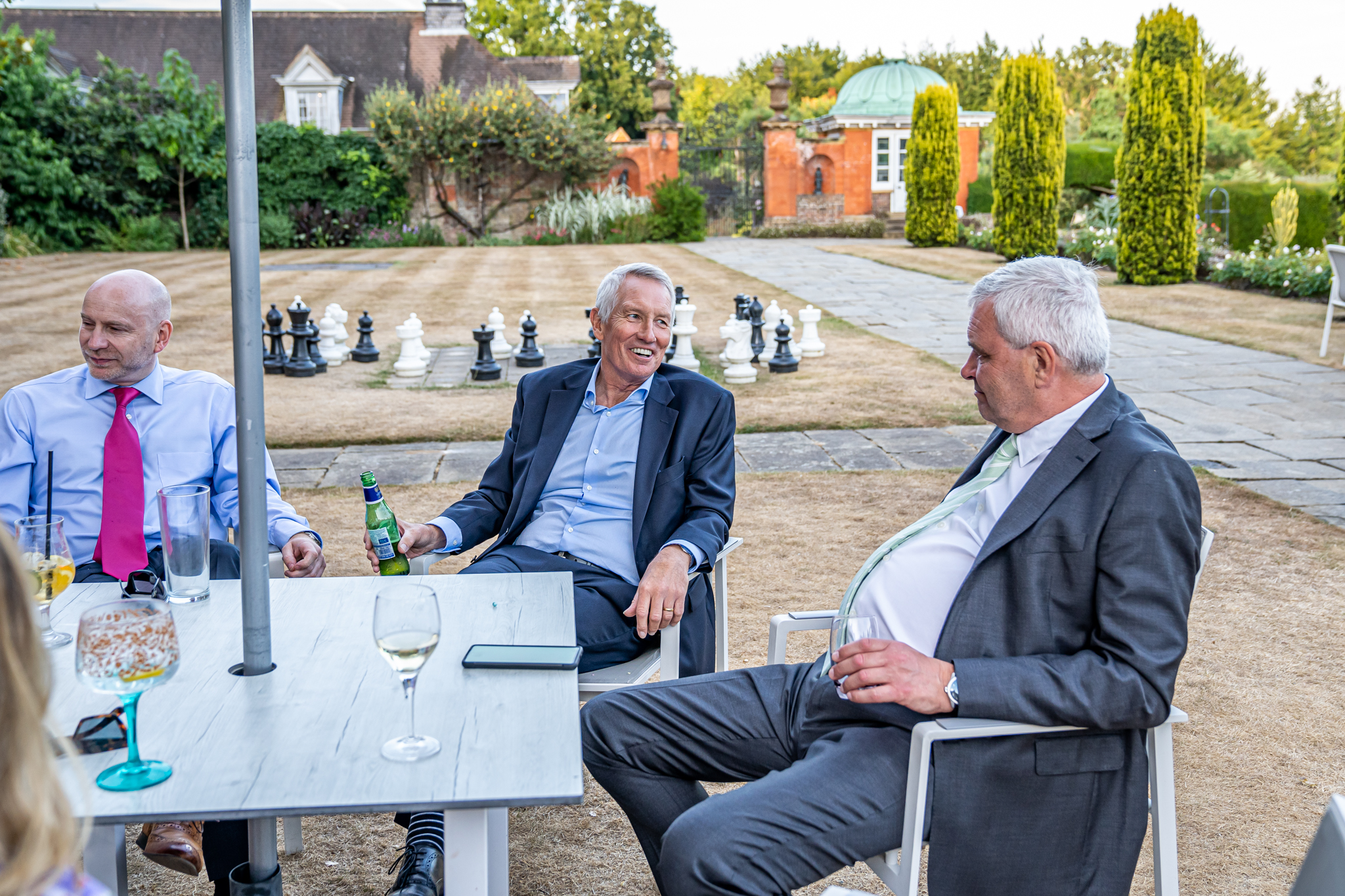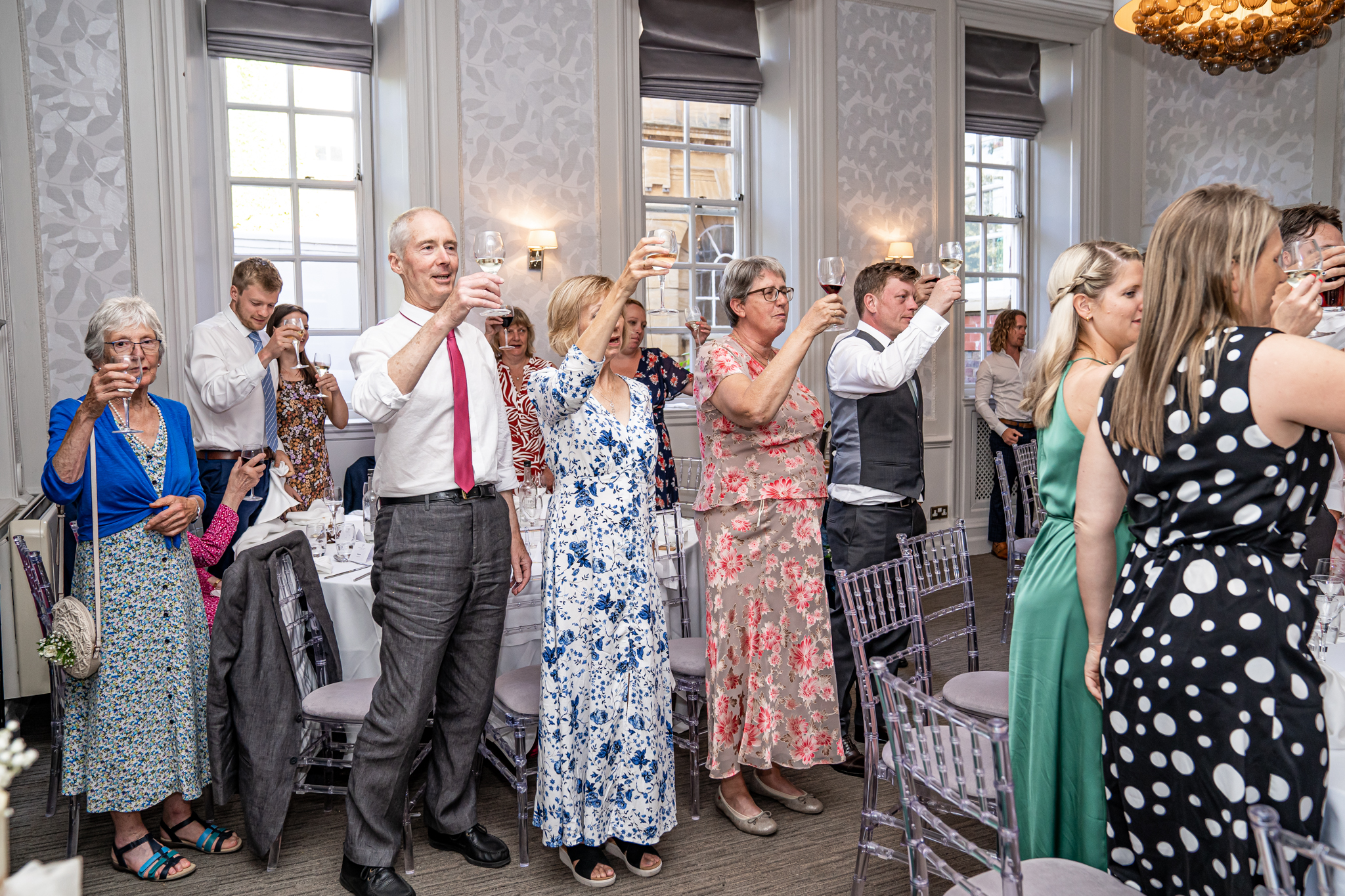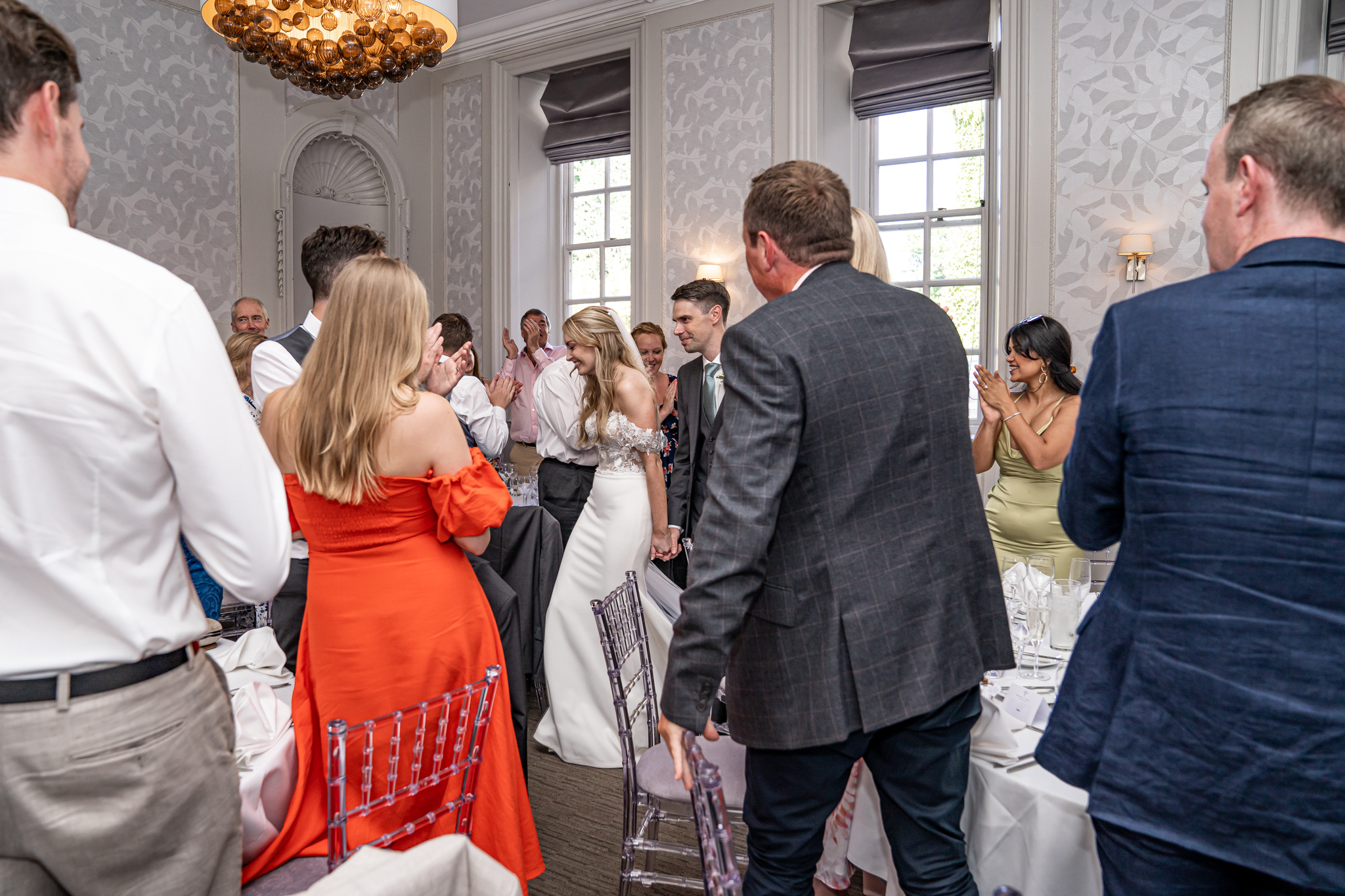 After I photographed the confetti shots and some cute pooch shots of the newlyweds with their pups, we then all headed back to Barnett Hill Hotel for Steph and James’s wedding reception. The couple had their champagne reception outside in the summer sunshine, I then photographed the group shots by the koi carp pond.