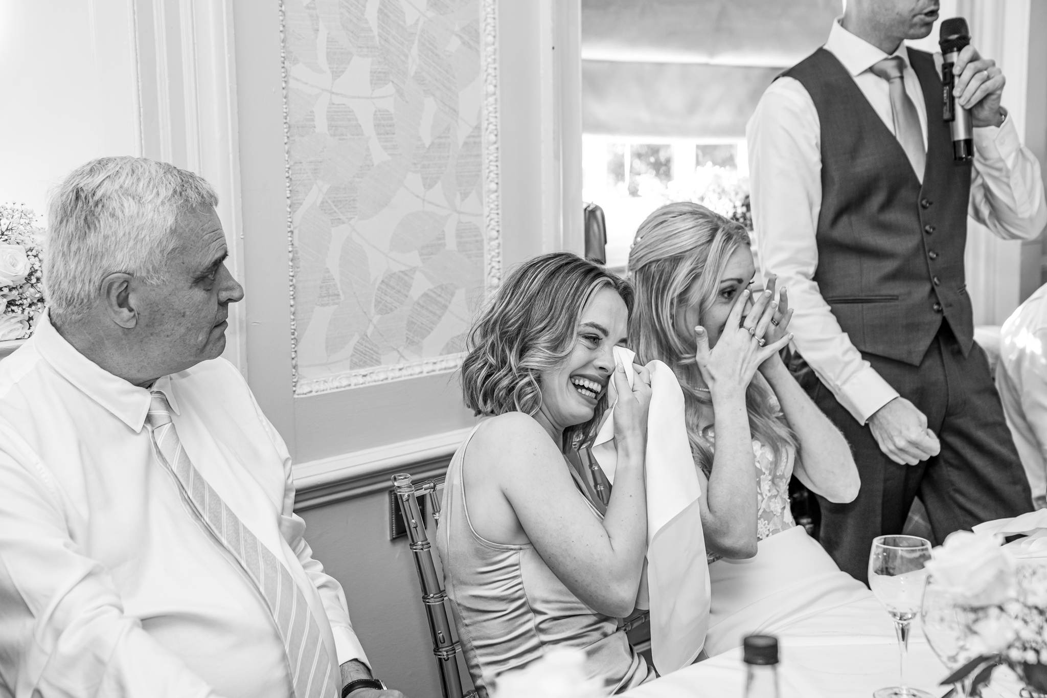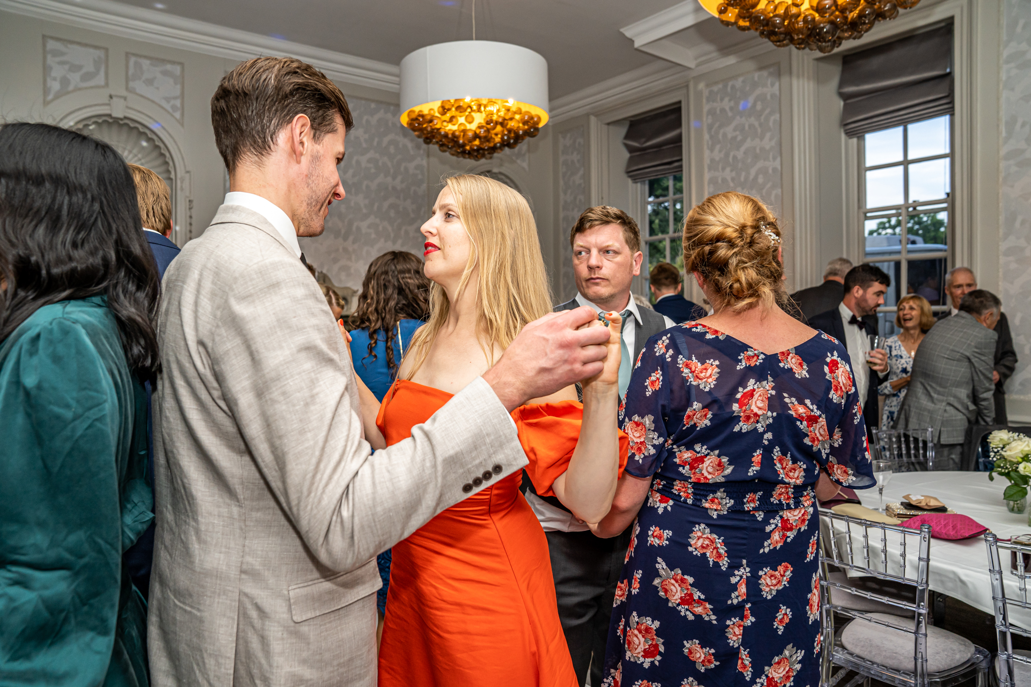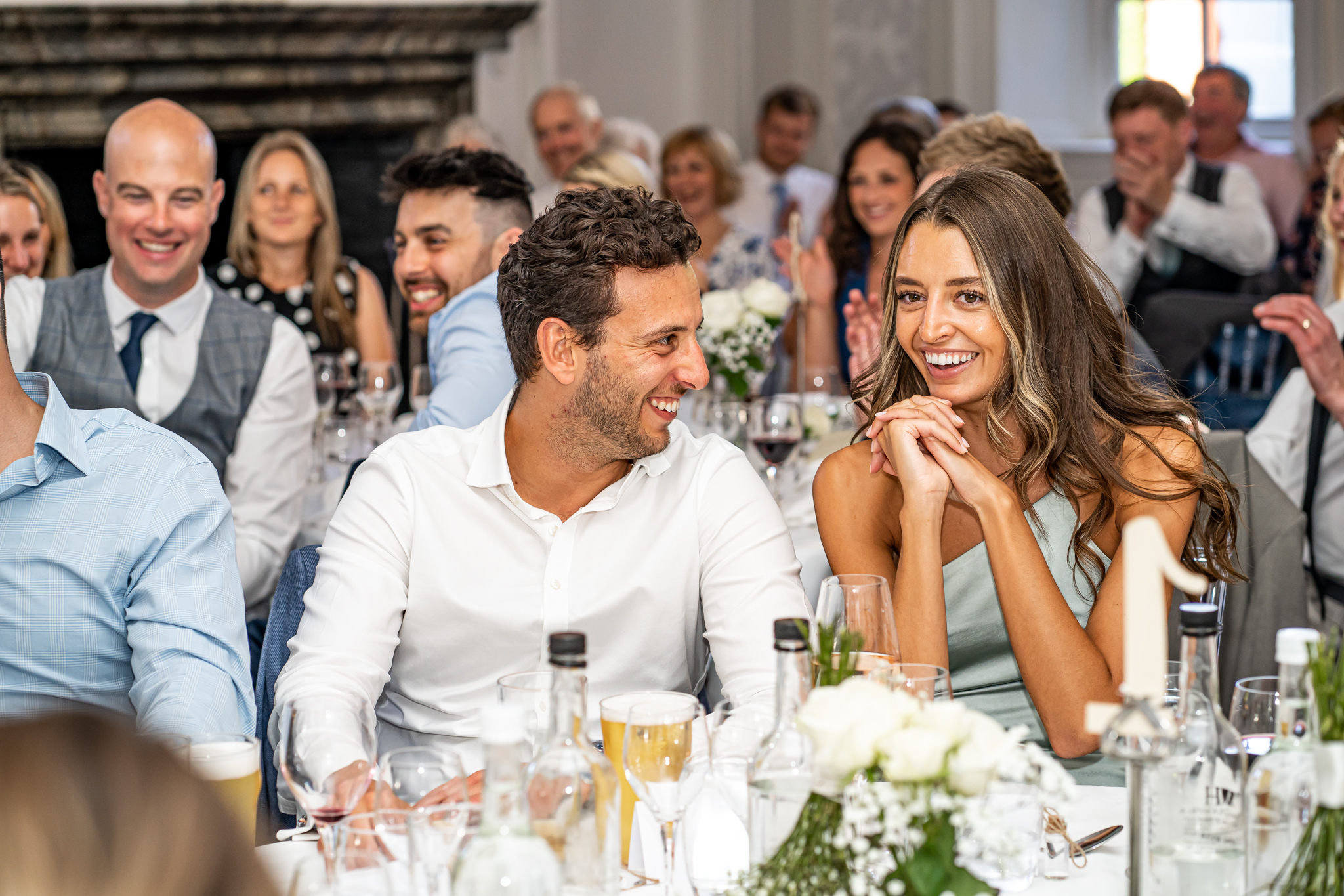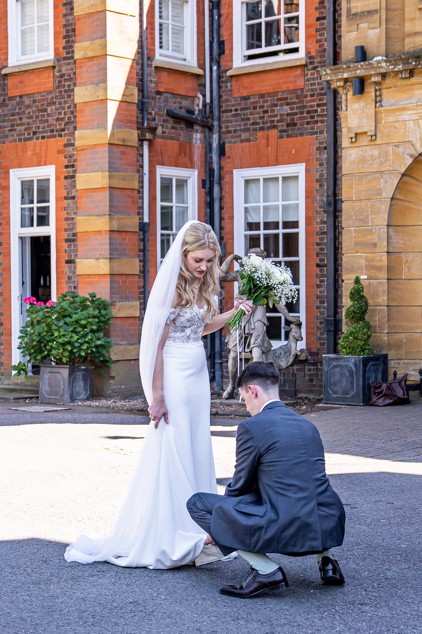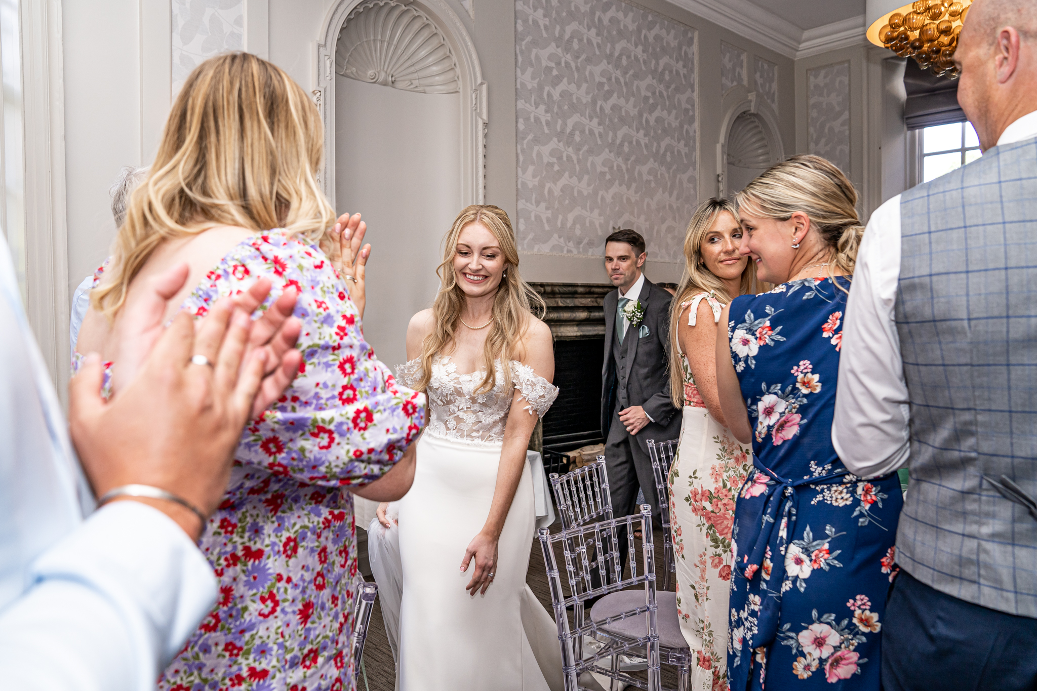 After I photographed the confetti shots and some cute pooch shots of the newlyweds with their pups, we then all headed back to Barnett Hill Hotel for Steph and James’s wedding reception. The couple had their champagne reception outside in the summer sunshine, I then photographed the group shots by the koi carp pond.
