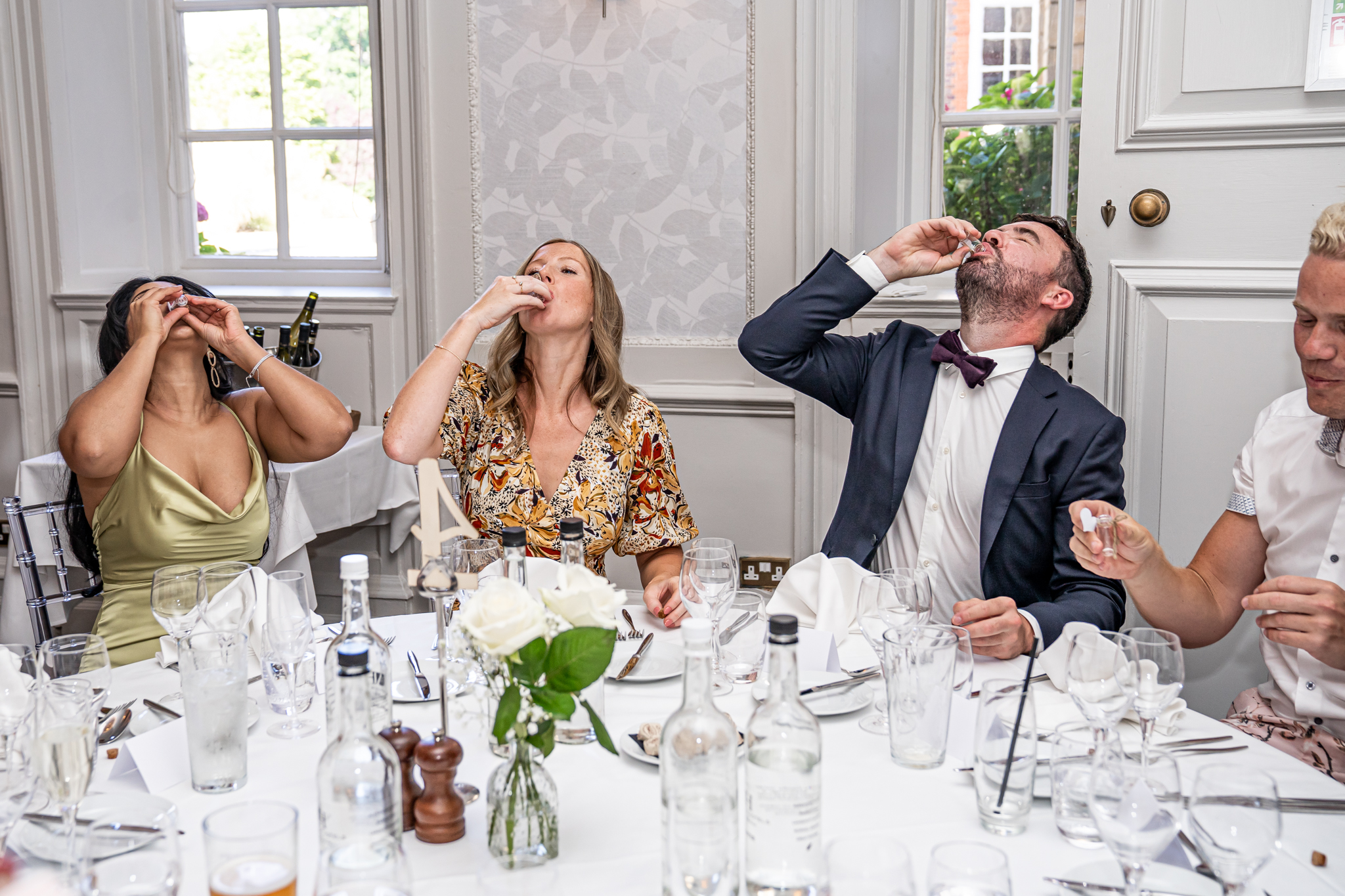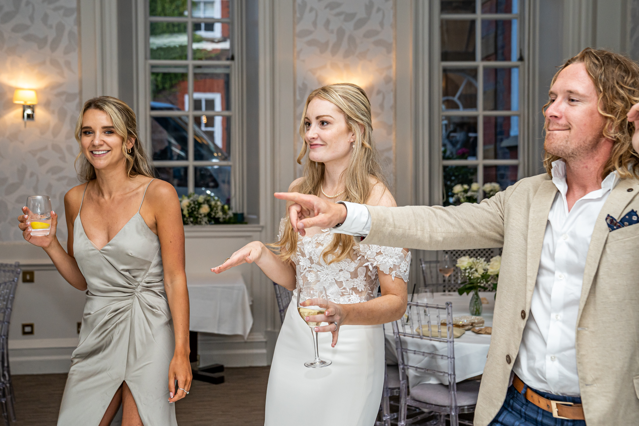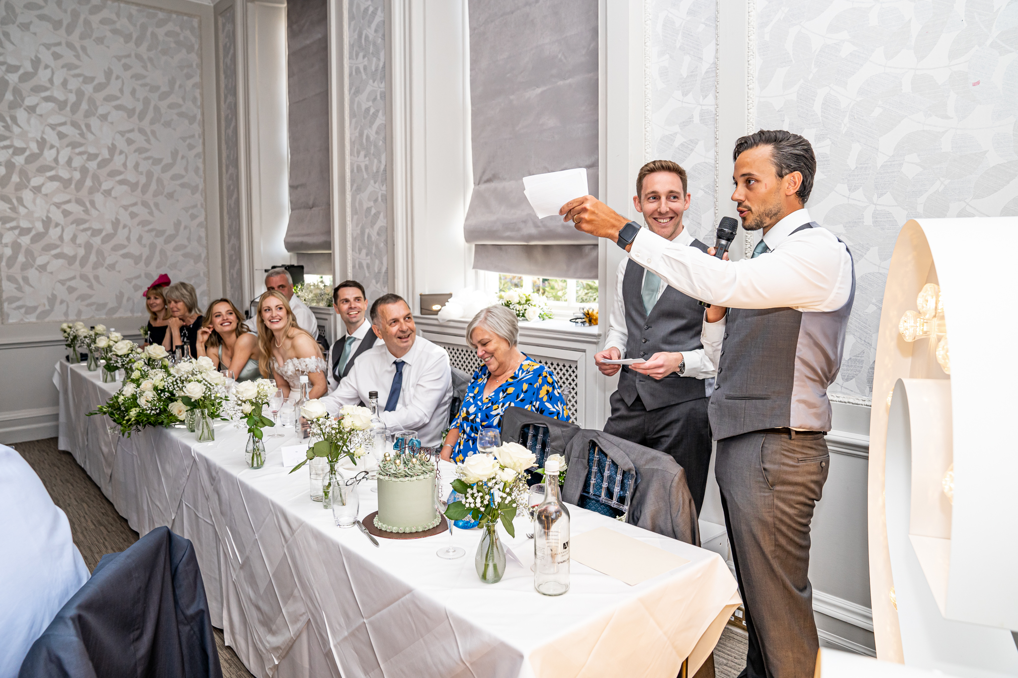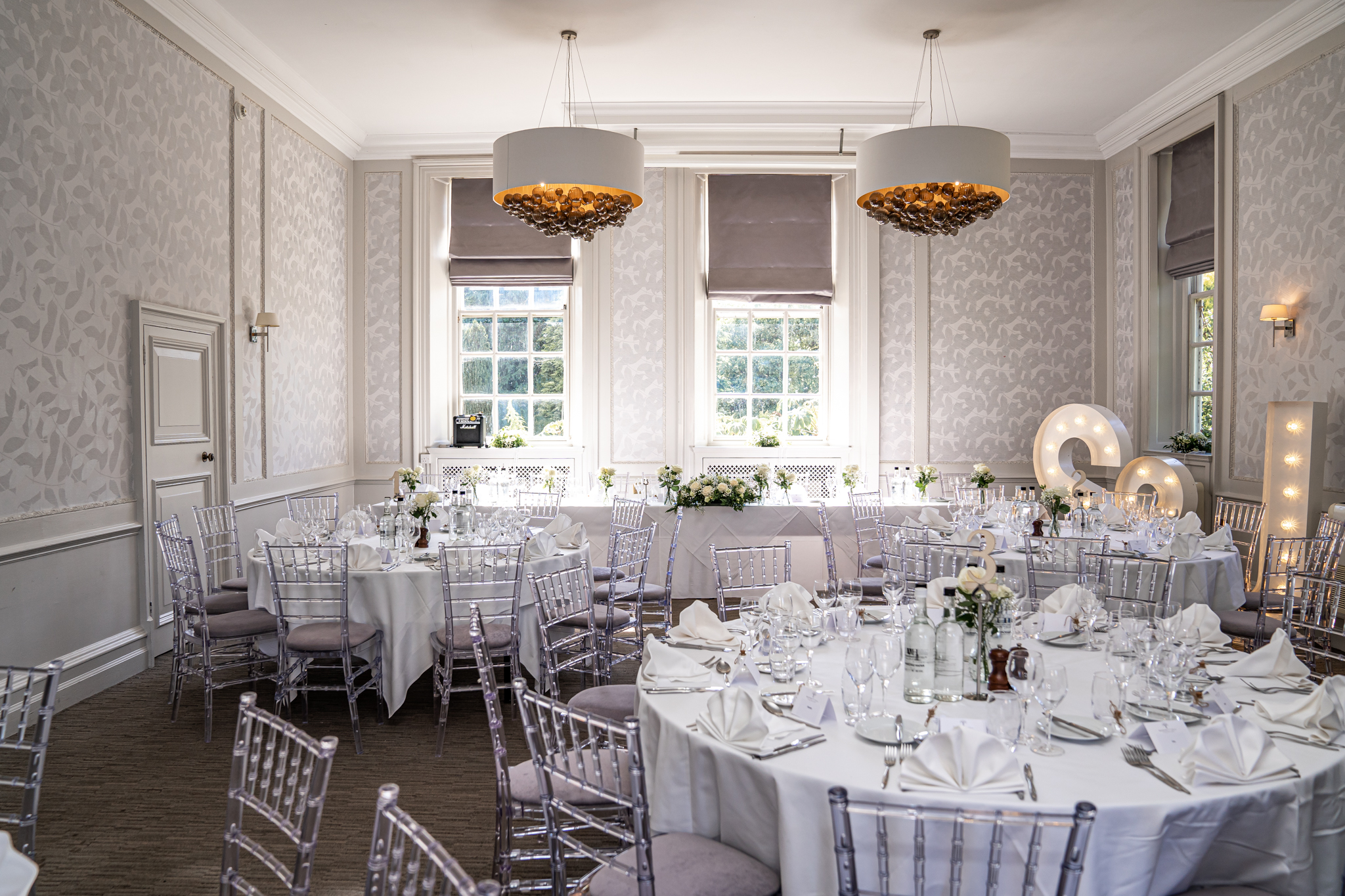 The wedding breakfast took place in the beautifully air conditioned Garden Suite, the emotional speeches followed afterwards from the father of the bride, the groom and the best man. Everyone then went out to the terrace for drinks while the room was turned around for the evening with the band, the dance floor and the wedding cake set up, the smaller room opposite was set up as a fun photo-booth and a bar.