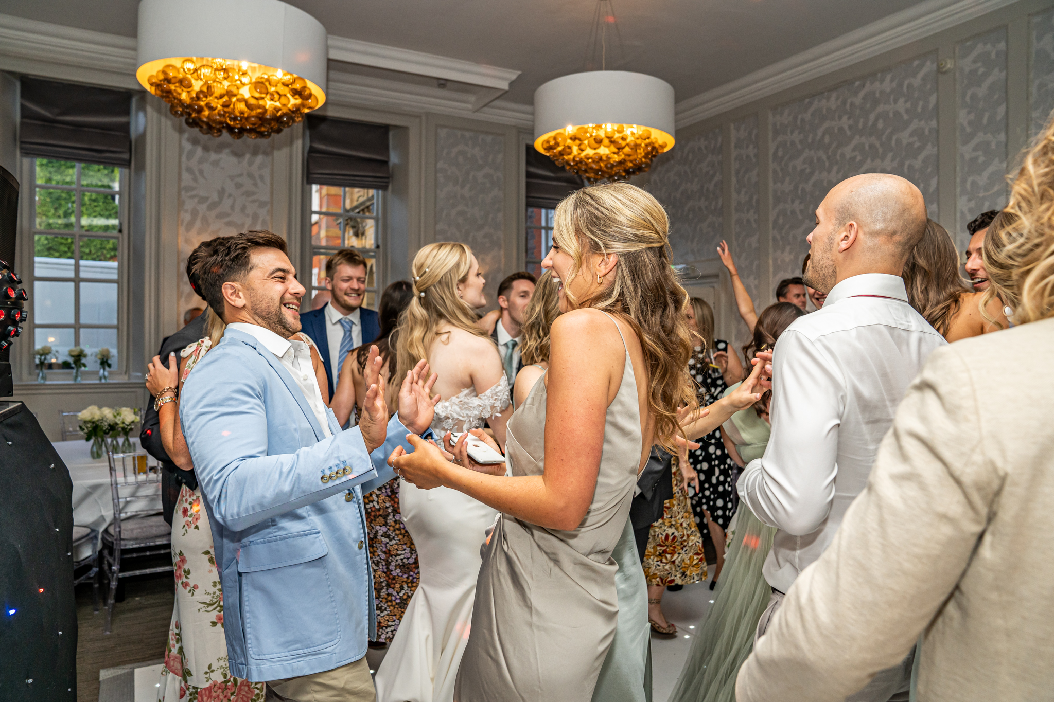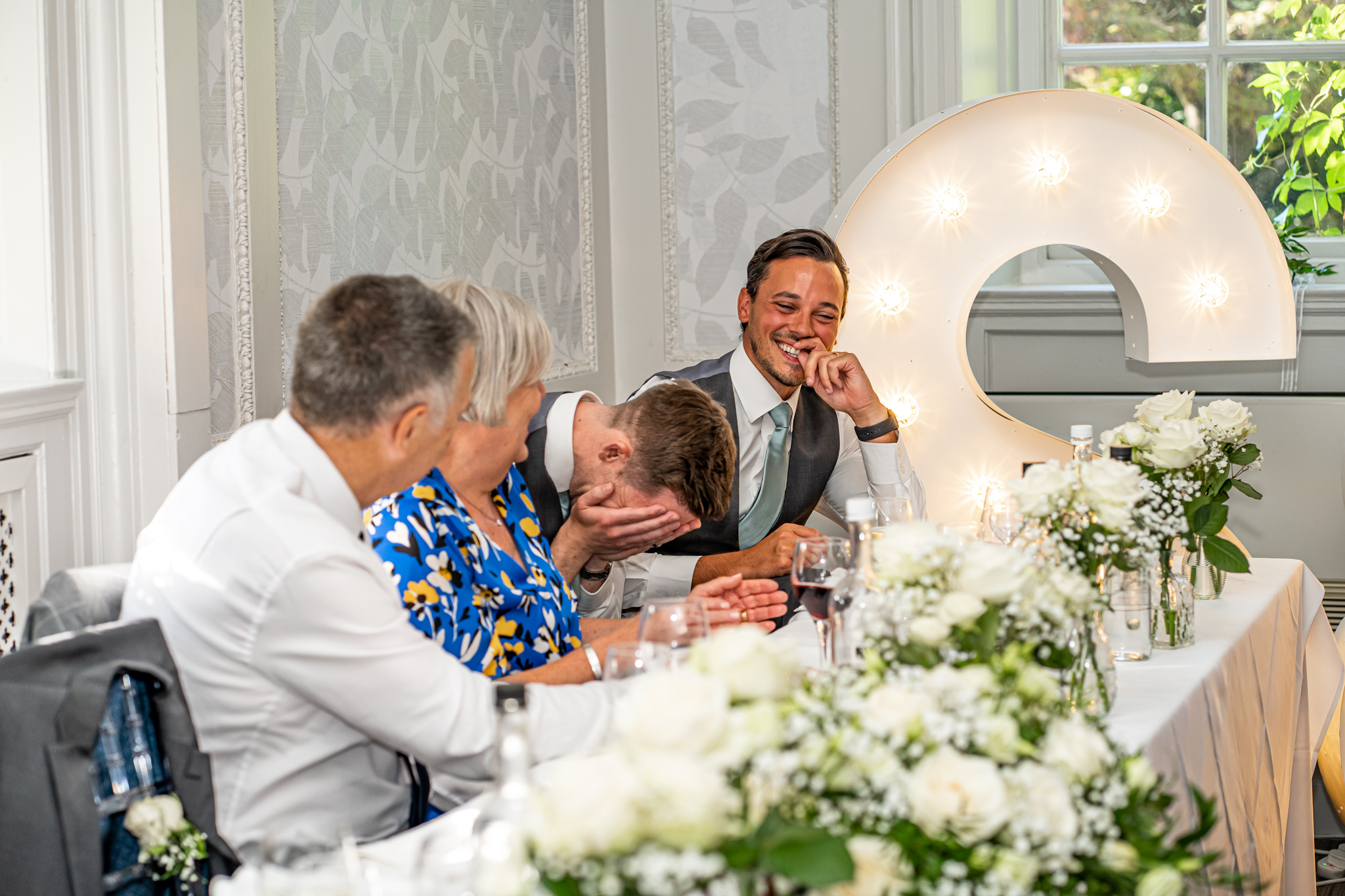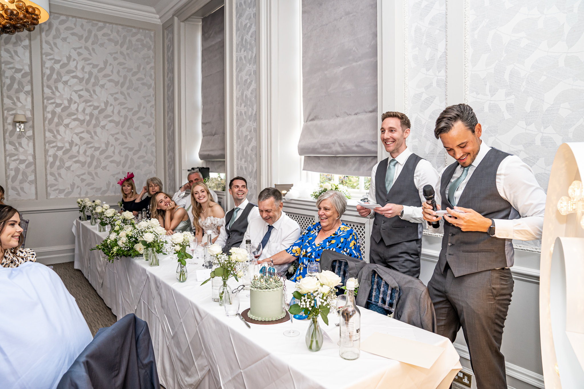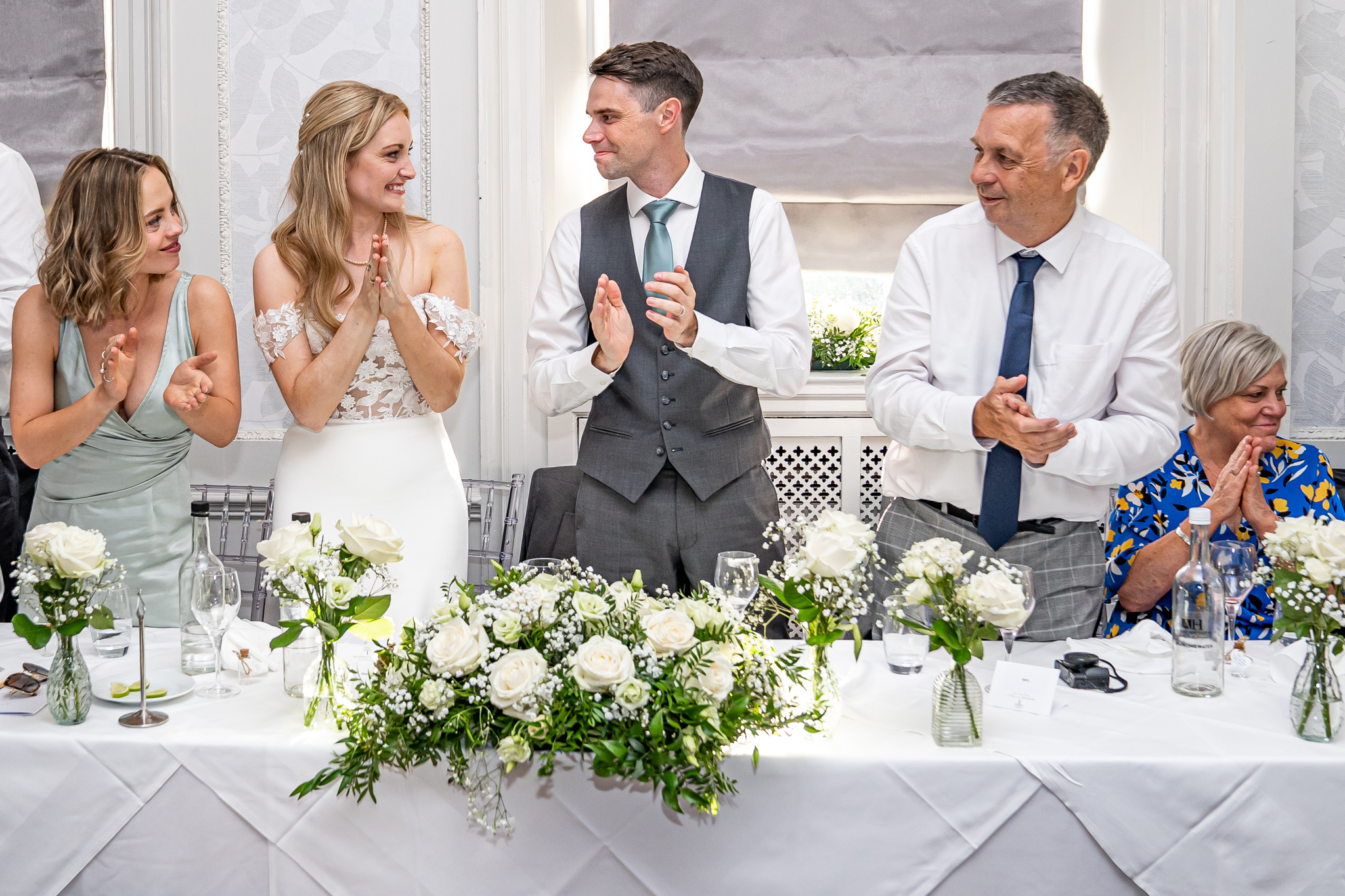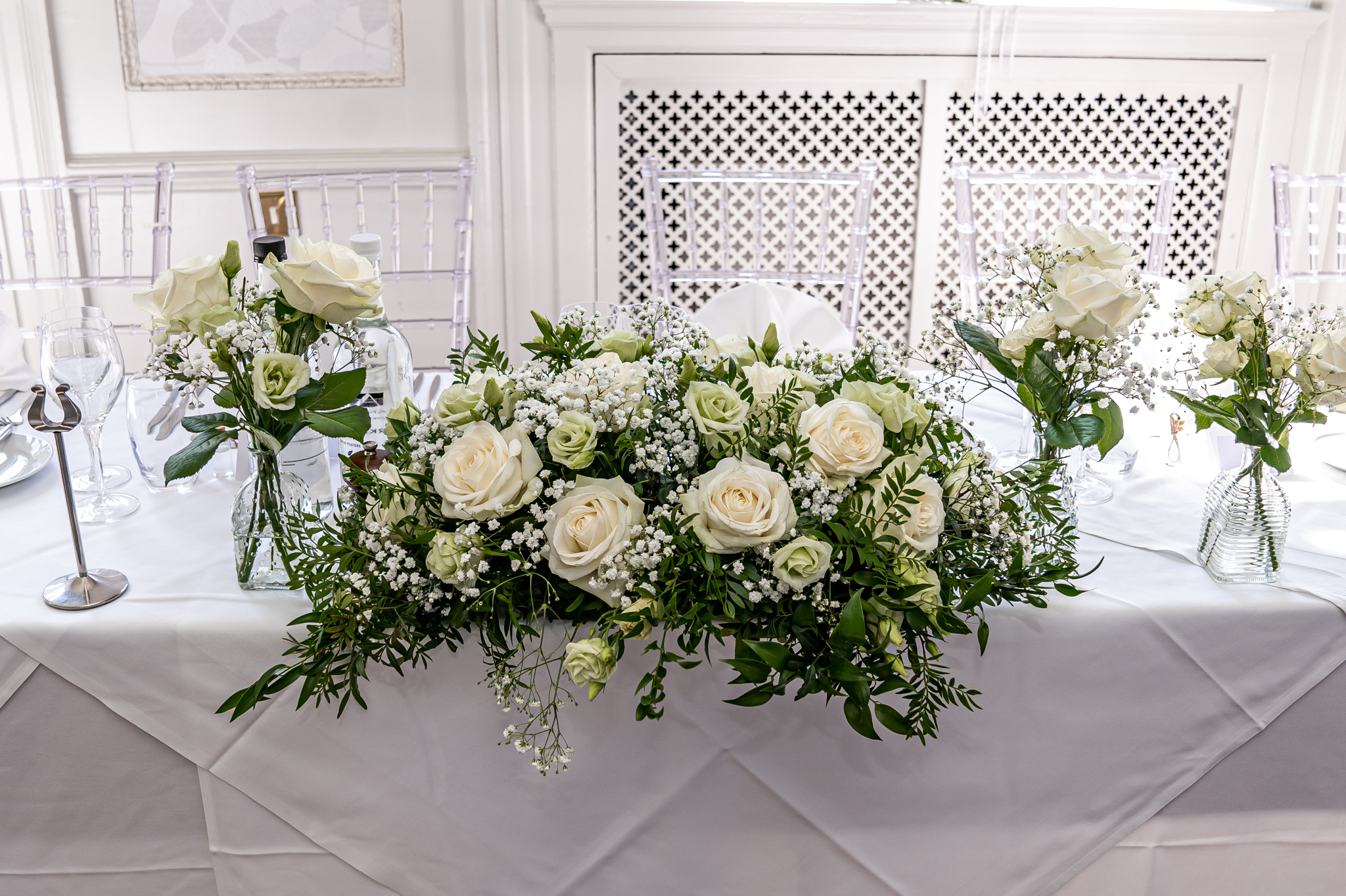 The wedding breakfast took place in the beautifully air conditioned Garden Suite, the emotional speeches followed afterwards from the father of the bride, the groom and the best man. Everyone then went out to the terrace for drinks while the room was turned around for the evening with the band, the dance floor and the wedding cake set up, the smaller room opposite was set up as a fun photo-booth and a bar.