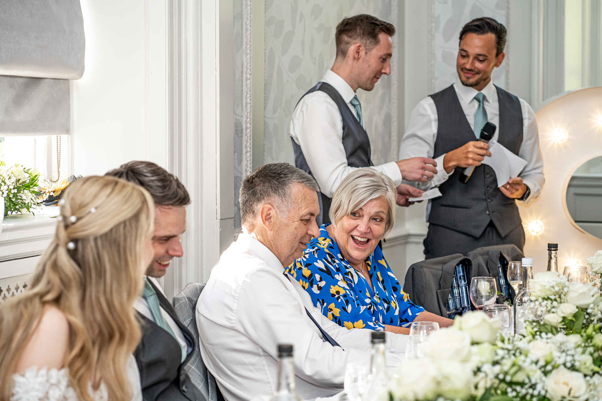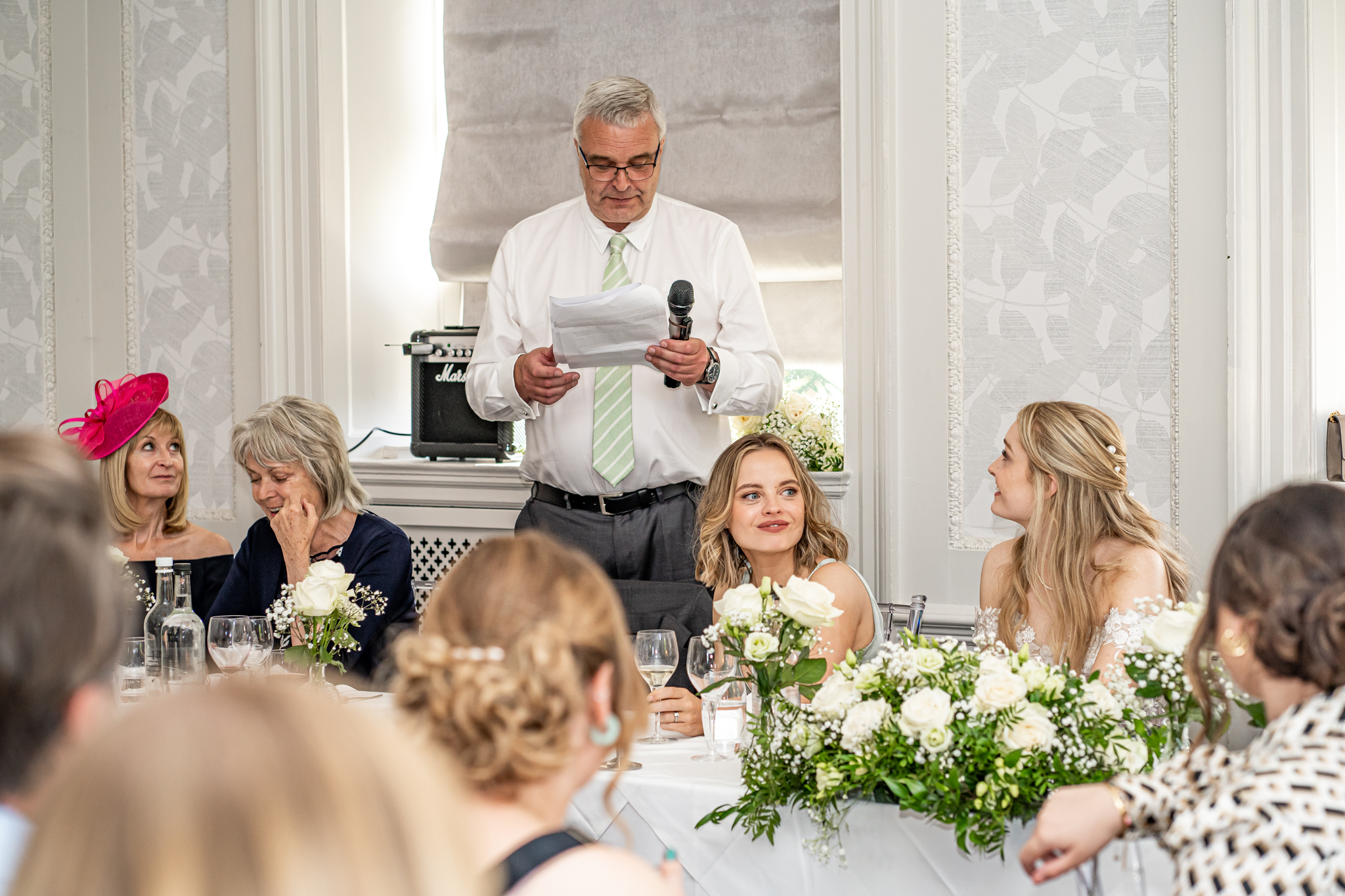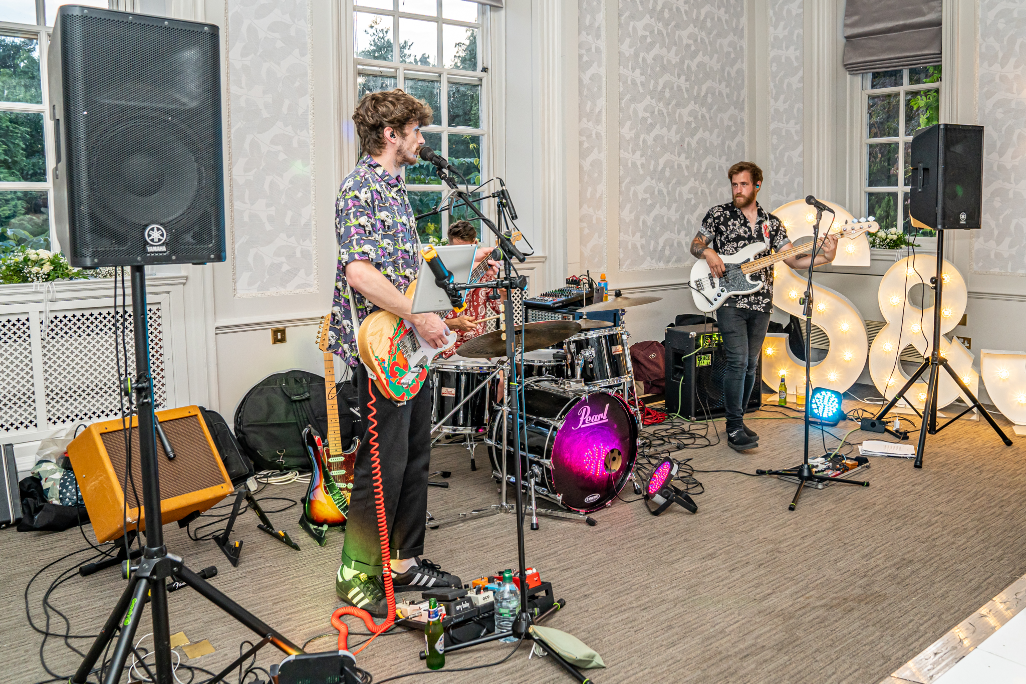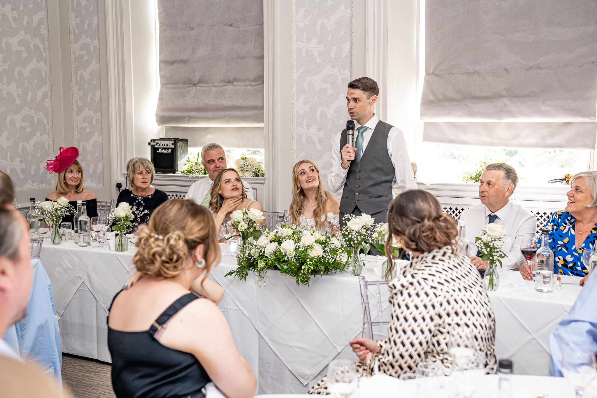 The wedding breakfast took place in the beautifully air conditioned Garden Suite, the emotional speeches followed afterwards from the father of the bride, the groom and the best man. Everyone then went out to the terrace for drinks while the room was turned around for the evening with the band, the dance floor and the wedding cake set up, the smaller room opposite was set up as a fun photo-booth and a bar.
